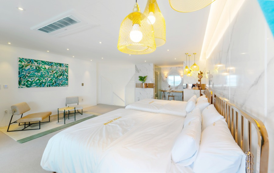 더블베드와 트윈베드가 있어 편하게 묵을 수 있으며, 거실에서는 멋진 다이닝을 즐길 수 있게 취사도구를 비롯해 냉장고와 정수기, 쿡탑 등이 준비되어 있다. 객실 내에서는 빔프로젝터로 영화를 볼 수 있다.