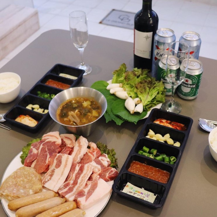르그랑블루 리조트에서는 BBQ도 가능하다. 고기부터 조미료까지 다 포함된 BBQ세트를 판매하고 있어 번거롭게 따로 준비할 필요 없이 즐기기만 하면 된다. 사용 2일 전 정오까지 신청해야 하며, 2인 세트 요금은 80,000원이다.