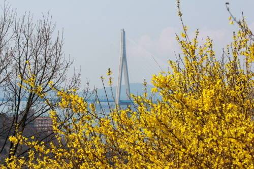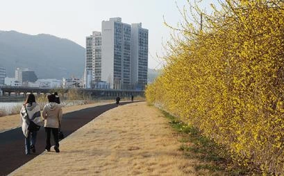순천의 동천은 구도심을 따라 흐르는 강으로 봄이면 일명 30리 벚꽃길로도 유명한 곳이다. 벚꽃 아래로는 샛노란 개나리들도 가득 피어 눈이 2배로 즐겁다! 순천의 개나리 개화 예상 시기는 3월 20일이다.