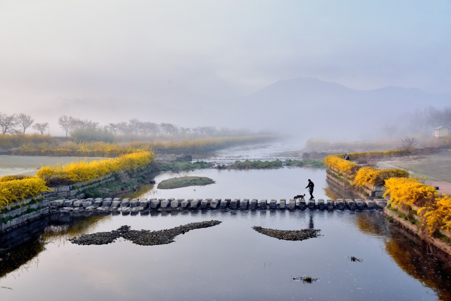 담양 증암천은 증암천을 따라 피어난 개나리 반영을 볼 수 있는 스팟이다. 냇가를 따라 피어난 개나리를 벗삼아 산책을 하기에도 참 좋고, 잔잔한 물결 위로 비친 샛노란 반영을 촬영하기에도 참 좋다! 담양의 개화시기는 3월 23일 쯤이다.