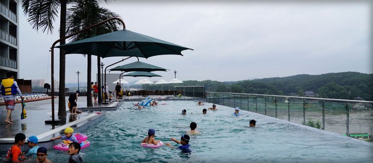 워터파크에서는 다양한 풀장과 야외파도풀, 슬라이드와 유수풀을 이용할 수 있는데, 지금은 계절상 주말 및 공휴일에만 실내수영장(유수풀)을 이용하실 수 있어요. 단, 3월은 1일~20일까지 휴장하니 참고!