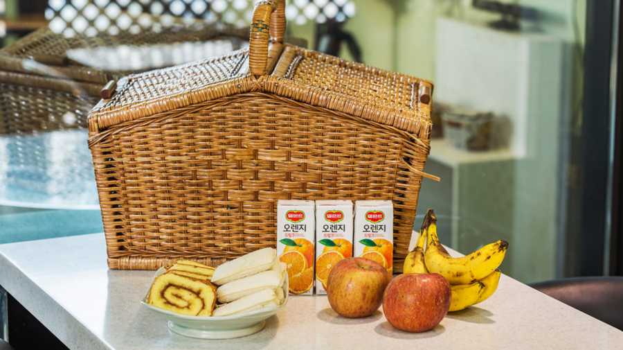 아침에 가볍게 식사하실 수 있도록 컵라면 2개와, 각종 스낵, 과일, 음료 등으로 구성된 조식이 웰컴 바구니에 담겨 제공되고 있다.
