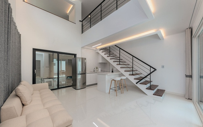세인트21펜션은 신축 펜션으로 전 객실이 독채, 복층 구조로 운영되는 곳이다. 1층은 거실과 주방, 수영장, 테라스로 구성되어 있으며 2층은 침실 겸 영화 감상 공간으로 꾸며져 있다.