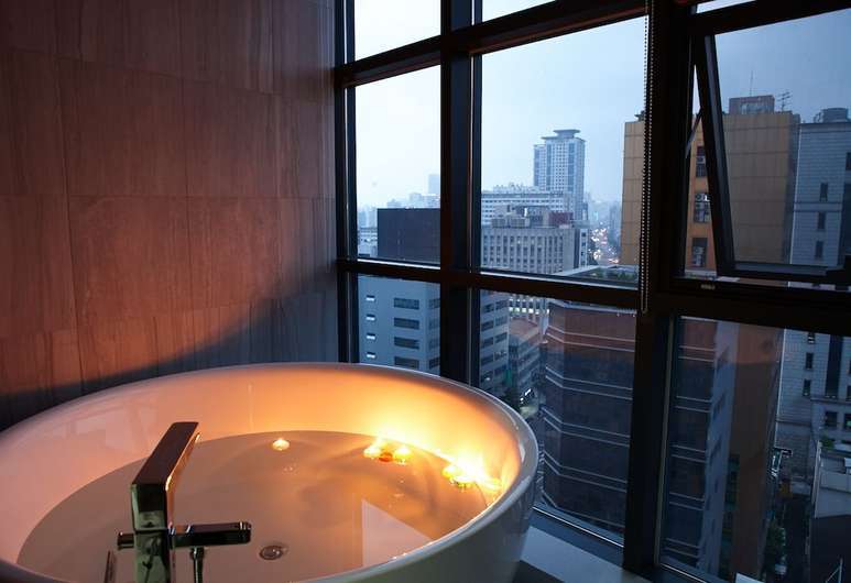 객실이 크다고 할 수는 없지만 내부에서 도시 혹은 남산 타워를 볼 수 있고, 깔끔하고 모던한 디자인이 특징이다. 숙소 내부에 욕실은 창문 밖을 바라보며 반신욕을 할 수도 있고, 내부와도 작은 창문으로 연결되어 있다. 서울의 야경을 보며 와인 한 잔과 반신욕을 즐긴다면 얼마나 로맨틱할까.
