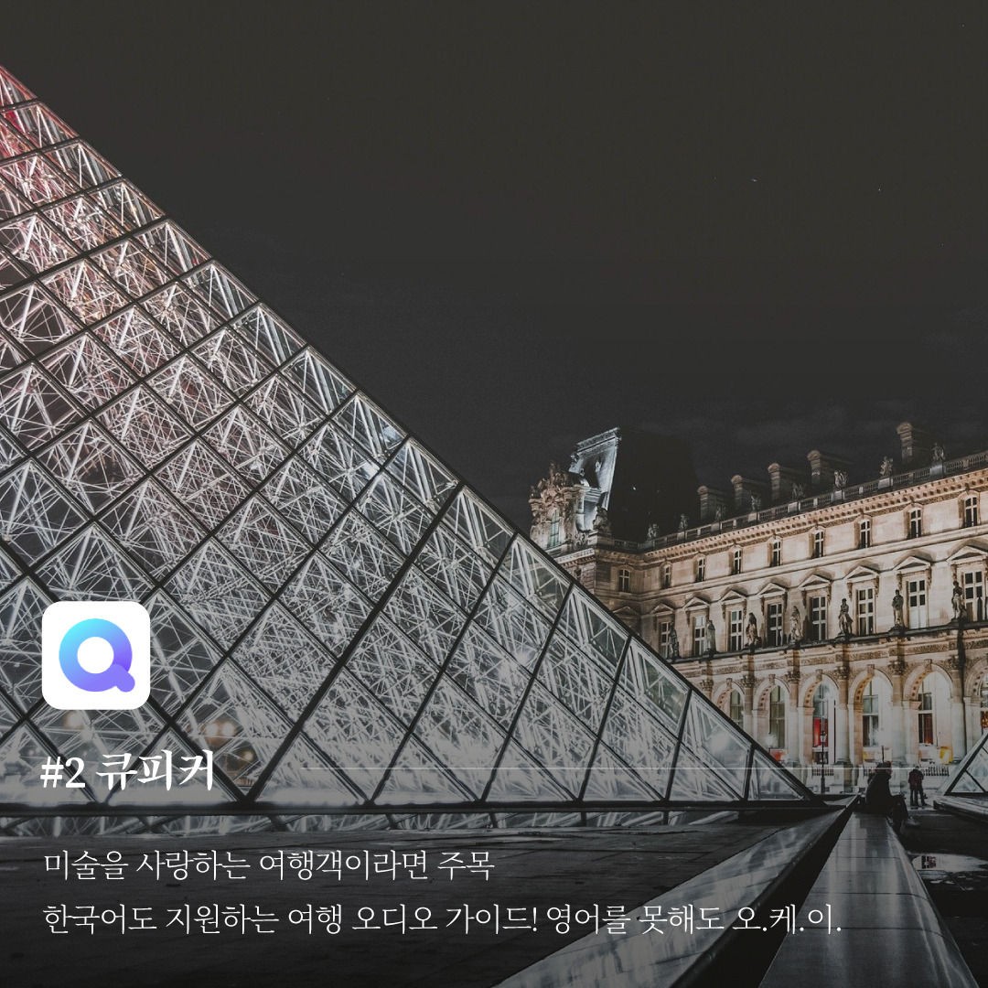 큐피커는 역사와 미술을 사랑하는 여행자에게는 필수 앱이다. 런던에는 무료로 입장 가능한 갤러리만 해도 수백 개가 넘고, 어디를 가야 할지 모를 때 큐피커만 있으면 된다. 앱을 통해 가장 핫한 전시 정보도 보고 내 주변 뮤지엄 탐색, 작품 스캔 검색 등이 가능하다. 현재는 한국과 런던만 서비스가 오픈됐지만 추후 파리, 암스테르담, 뉴욕, 로마 등 전 세계에 걸쳐 서비스할 예정이다. 특히 제가 가장 애용하는 기능은 해외 뮤지엄 한국어 오디오 가이드이다. 루트까지 함께 안내되어 있어 초행자도 쉽고 재미있게 미술 작품을 즐길 수 있다. 한국에서 다운로드 받아가시면, 현지에서 데이터 접속이 원활하지 않아도 문제없다. 아직 여행 계획이 없다고, 시큰둥할 필요 없다. 지금 접속하면 모든 오디오 가이드를 무료로 내려받을 수 있다. 집콕하고 있는 요즘이야말로, 큐피커를 들으며 여행 계획 짜기 딱 좋은 때이다. 올스테이로는 전 세계 숙소를, 큐피커로는 뮤지엄과 갤러리를 미리 둘러 보자.