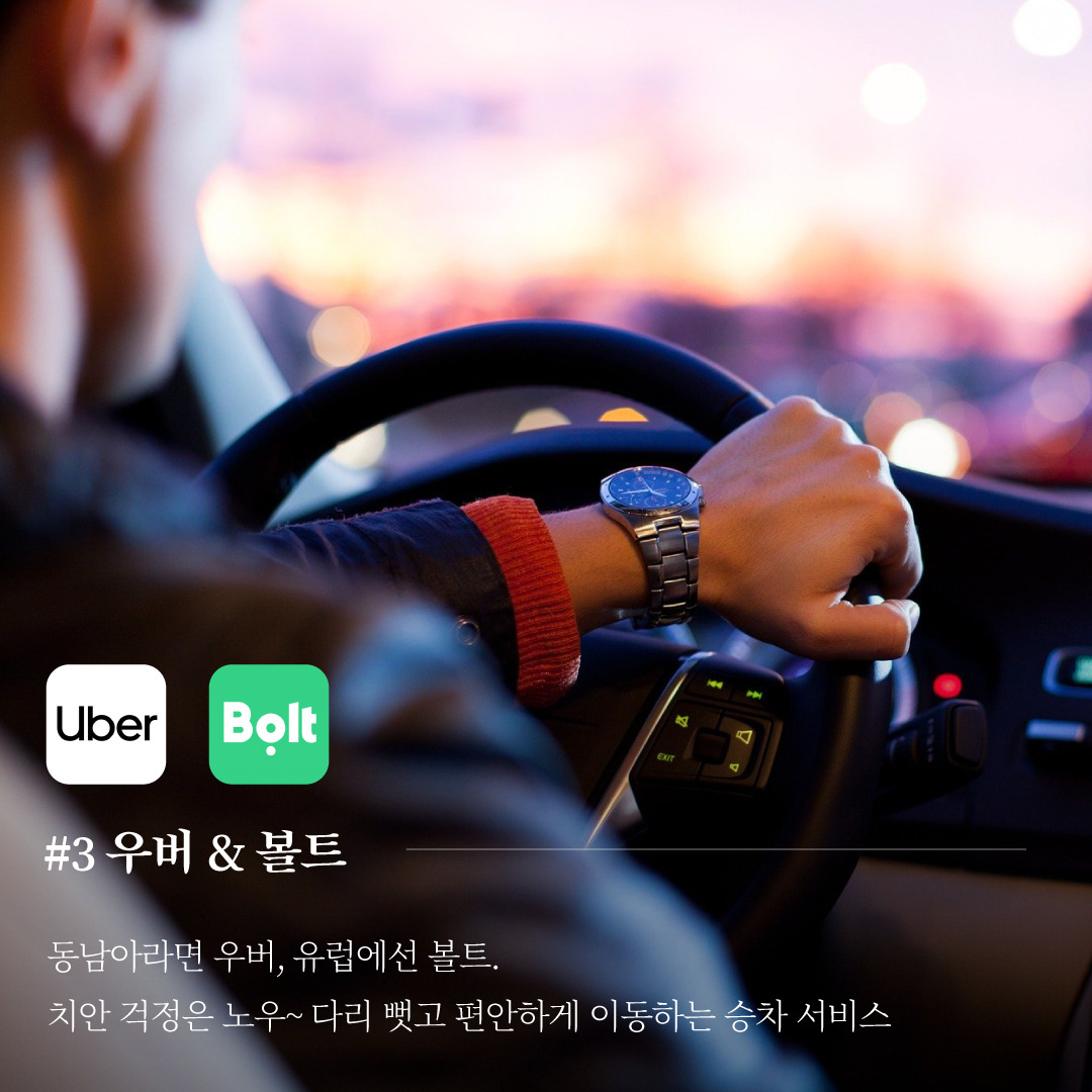 우버는 스마트폰을 기반으로 한 승차 공유 서비스로, 현지 언어를 전혀 할 줄 몰라도 앱으로 호출해서 주소를 말할 필요도 없이, 원하는 장소로 이동 가능하다. 택시보다 요금은 훨씬 저렴하고, 기사님들 평점을 확인할 수 있어 안심하고 탈 수 있다. 탑승 중 불만 사항이 있었다면 우버를 통해 바로 보고할 수도 있다. 우리나라뿐만 아니라 우버가 불법인 도시가 꽤 많다. 혹은 우버 말고 다른 어플이 대세인 경우도 있고 베트남은 그랩, 중국은 디디추싱이 대표적이다. 런던에서는 최근 운전자가 계정 정보를 직접 바꿀 수 있다는 우버의 허점 때문에, 불법 논란이 일기도 했다. 그래서, 승차 공유 서비스를 이용할 예정이라면 사전에 이런 현지 정보를 미리 확인해 보시는 게 좋다. 런던을 오신다면 볼트(Bolt)를 추천한다. 우버보다 요금도 저렴하고 프로모션 코드를 입력하면 첫 탑승은 무료 혹은 12파운드까지 할인받을 수 있다. 공항에서부터 바로 이용할 예정이면, 한국에서 설치하고 오는 것을 추천한다.
