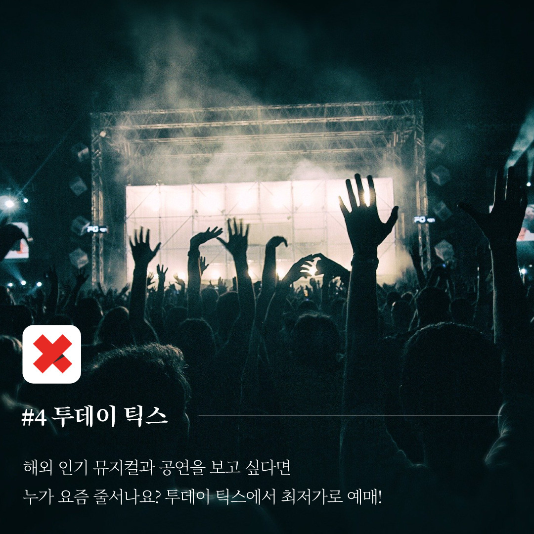 투데이 틱스는 다양한 문화 공연에 대한 디지털 발권 플랫폼이다. 여행 중 뮤지컬이나 연극 관람 계획이 있다면 꼭 설치해보자. 세계 뮤지컬 양대 산맥인 런던과 뉴욕을 포함해 보스턴, 멜버른, 시애틀 등 전 세계 여러 도시에서 서비스 중이다. 가장 핫한 공연의 티켓을, 최저가에 구매할 수 있다. 웨스트엔드가 있는 런던을 살펴보면 이해하기 쉽다. 데일리 더즌, 러쉬 티켓, 로터리 등의 이벤트로 뮤지컬 티켓을 기존가보다 훨씬 저렴하게 판매하고 있다. 위키드를 15파운드에, 해리포터 연극을 40파운드에 볼 수 있다. 새벽부터 줄 서서 기다려야 하는 데이시트 보다도 싸니, 이보다 스~마트 할 수 없다.