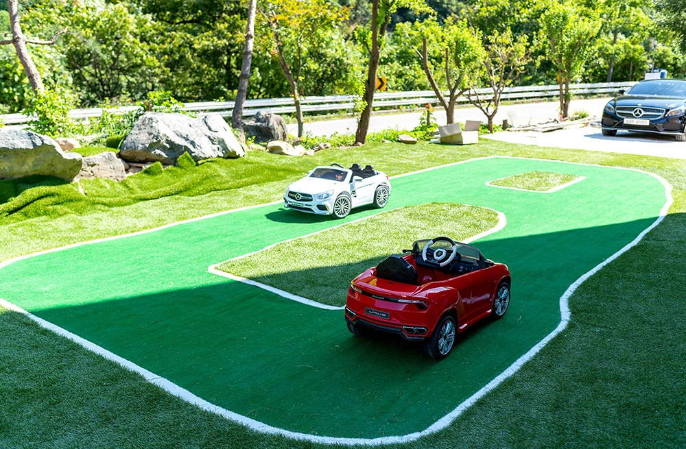 객실에만 즐길거리가 있는게 아니다. 야외에도 자동차 트랙과, 야외 수영장이 마련돼 있다. 아이들이 집에 가기 싫어한다는 후기가 괜히 보인게 아닐 정도!