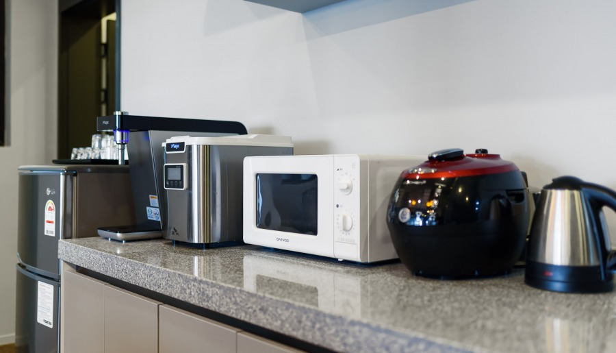 바비큐 룸이 있긴 하지만, 아침 식사 등을 만들 공간은 따로 또 필요할 것이다. 주방이 여느 가정집 못지않게 잘 갖춰져 있다. 전기밥솥, 냉장고, 전자레인지, 전기 주전자, 정수기, 제빙기, 식기류 등 취사도구는 없는 게 없다.