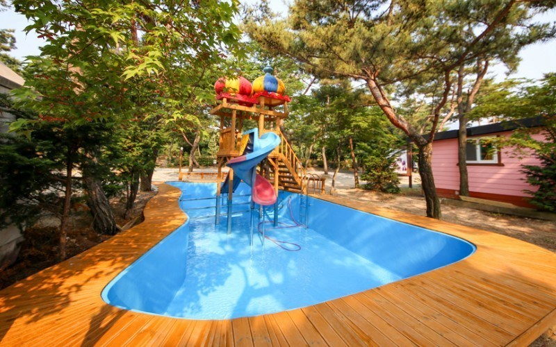 “캠핑 와서 계곡에서 놀면 충분하지”라는 건 순전히 어른들의 생각! 아이들에게는 플러스알파가 필요하지 않겠는가? 가족 여행객을 위해 어린이 수영장과 트램펄린이 갖춰져 있다. 이외 공용 샤워실과 화장실도 당연히 갖췄다.