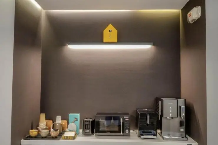 가져온 음식을 데우거나 커피 또는 차를 마시고 싶다면, 카운터 옆에 있는 공용 구역을 찾아보자. 언제든 전자레인지와 커피 머신, 정수기를 이용할 수 있다.