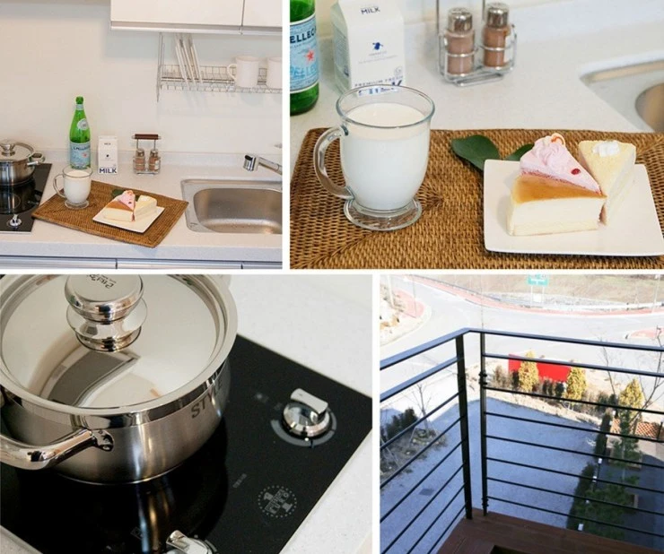 주방에는 냉장고 및 커피포트와 전기밥솥, 인덕션, 각종 조리도구와 와인잔, 코르크 따개, 조미료도 세심하게 준비해뒀다.