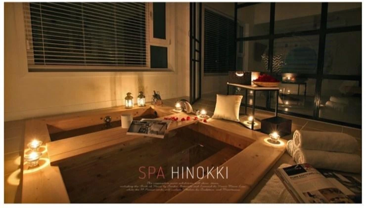 세느룸을 비롯해 빌라동 객실에선 히노끼 스파를 할 수 있다. 삼림욕 효과가 뛰어난 편백나무로 지어져 다른 입욕제를 사용해선 안 되고, 미리 말해두면 청주를 구입해서 사용할 수 있게 해준다.