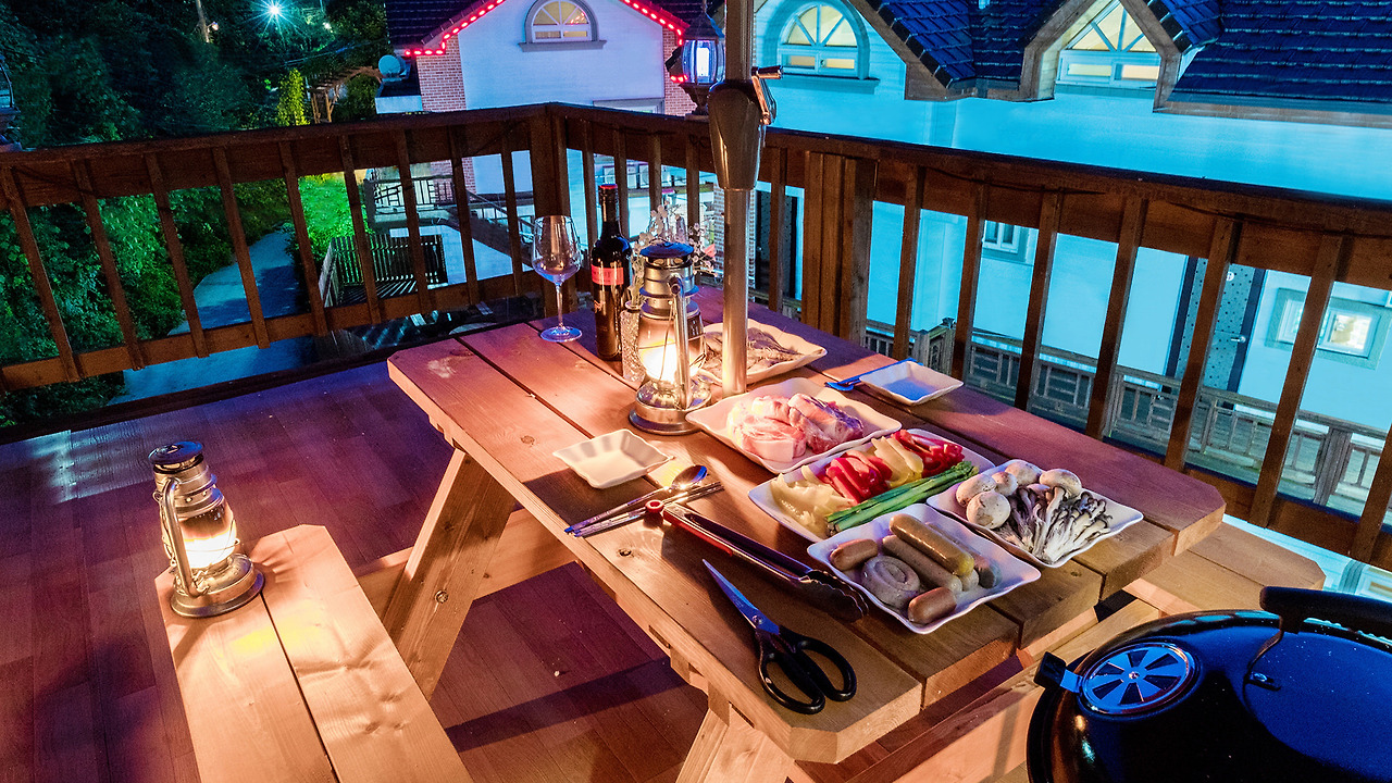 객실 별 데크에서 개별 바비큐도 가능하다. 숯과 그릴만 이용할 수도 있고, 장보기가 귀찮거나 시간이 없는 분들을 위해 바비큐 재료 패키지도 판매하고 있으니 편하게 바비큐를 즐겨보자. 특별한 날을 위해 저렴한 가격에 이벤트 패키지도 제공하고 있으니, 커플 여행에 딱이다.