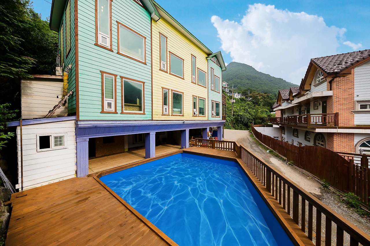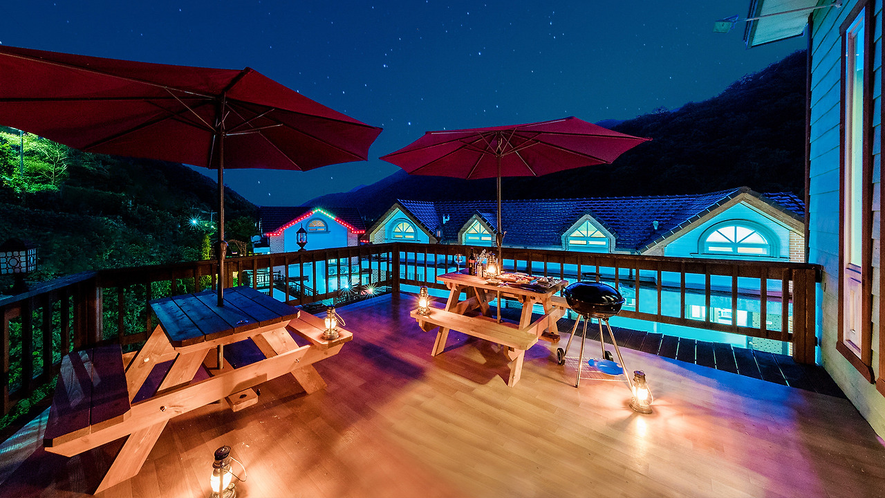 여름시즌에는 야외 수영장에서 수영도 즐길 수 있으며, 바비큐 데크가 있어 낭만적인 저녁시간을 보낼 수 있다. 날씨가 추운 경우에는 자이글도 대여해주기 때문에 날씨 걱정 없이 맛있는 바비큐를 즐길 수 있다. 체크인은 15시부터 가능하며 체크아웃은 11시까지다.