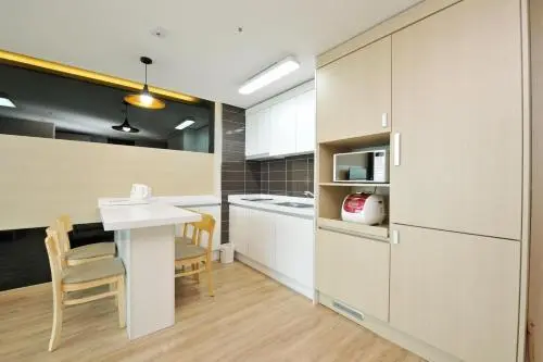 각 객실에 작은 주방이 공간이 있어 간단한 취사가 가능하기 때문에 아이와 편안히 객실에서 머물기 좋다.