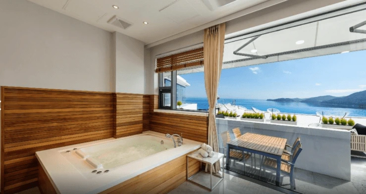 디럭스룸은 여수 르그랑블루에서 가장 인기 있는 객실 타입으로 스파가 가능하며, 전망이 트여있는 오션뷰를 감상할 수 있는 객실이다. 커플 객실로 추천한다.