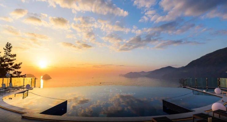 여수 르그랑블루 리조트의 최대 장점은 바로! 탁 트인 전망의 넓은 인피티니풀이다. 노을이 지는 모습을 가만히 바라보고 있으면 힐링이 저절로 된다.