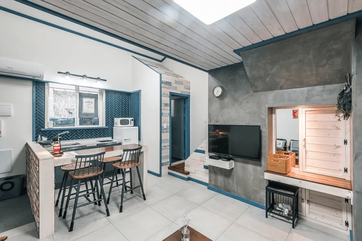 제주 로맨스파파의 전 객실 (빌라) 은 모두 바다를 마주 보고 일렬로 서 있는 똑같은 구조의 건물이다. 1층은 부엌 및 거실, 2층은 더블베드가 갖추어진 다락방 구조로 되어 있다. 앉아서 바깥 풍경을 보며 휴식을 취할 수 있는 공간 또한 2층에 마련되어 있으니, 따로 카페에 갈 필요 없이 분위기를 만끽할 수 있다.