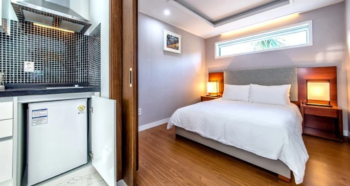 더쉼팡 풀빌라펜션은 완벽한 프라이빗 구조로 아늑하고 편안한 느낌을 선사하는 곳이다. 아름다운 조경을 감상할 수 있는 통창 거실과 취사도구가 완벽게 구비된 주방이 있으며, 침실은 슬라이딩 도어로 효율적으로 공간 분리가 가능하다.