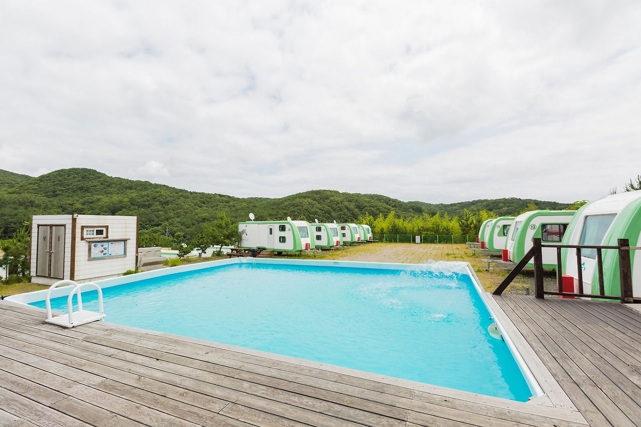 장기카라반캠핑장에서는 한 여름에는 시원한 수영장을 함께 이용할 수 있다. 특히, 어린이들의 반응이 좋아 어른과 아이 모두 즐거운 캠핑이 가능하다. 또, 애견 수영장도 있어 물을 좋아하는 반려견도 즐길 수 있다.
