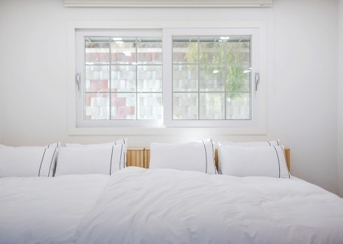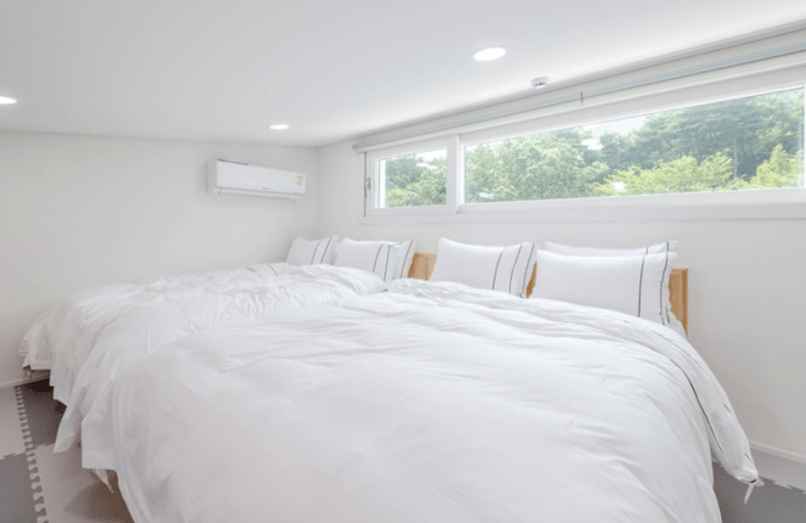 객실마다 공기청정기, 세탁기, 스타일러, 세스코, 음식물분쇄기 등이 구비되어 있다. 아이들을 위한 펜션인 만큼 아이들 식기나 화장실엔 아이를 위한 변기도 있다. 패밀리침대여서 넓은데, 조금 높기 때문에 침대 밑에 이불을 깔아두면 좋을 것 같다. 침구 상태는 좋으며 푹신해서 꿀잠 잘 수 있다. 화장실은 넓고, 샤워할 수 있는 공간과 변기가 구분되어 있다. 1층과 2층 모두 화장실이 있으며 바디워시, 샴푸, 컨디셔너, 비누, 치약이 제공된다.