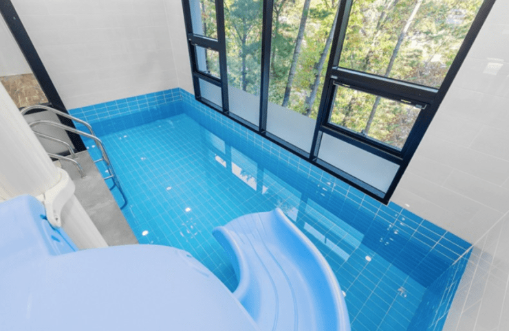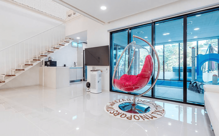 방이 독립적으로 사용할 수 있어서 소음이 없어서 편하게 머물 수 있다. 3시부터 체크인이고, 열 체크 확인 후에 입장 가능하다. 1층엔 풀장, 주방, 풀장 옆에는 바비큐 시설이 있으며 풀장엔 미끄럼틀, 구명조끼와 빨리 건조대도 있다. 거실이 통유리로 되어 있어서 아이들이 풀장에서 놀고 있을 때 거실에서 아이들이 노는 모습을 볼 수 있다. 복층엔 아이들을 위한 놀이터가 있는데 다양한 놀이도구가 있어서 아이들이 좋아할 수 밖에 없다.