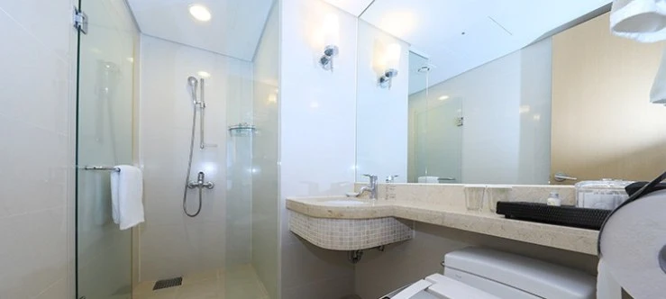 어메니티는 샴푸와 린스, 바디워시, 로션, 비누 등이 제공된다. 환경보호를 위해 1회용 칫솔과 치약은 구비되어 있지 않으며, 필요시 1층 편의점에서 구매가 가능하다.