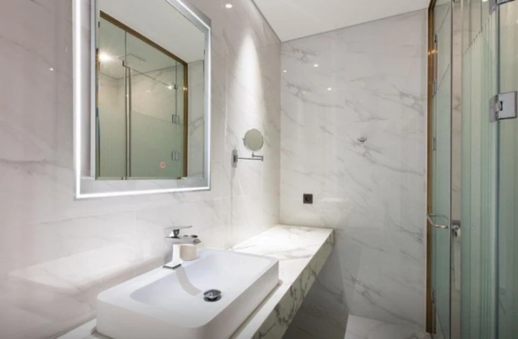 어메니티는 샴푸, 컨디셔너, 바디워시, 헤어 비닐캡, 바디 스펀지, 비누, 일회용 칫솔 및 치약, 면도기가 준비되어 있다.