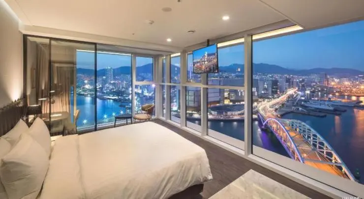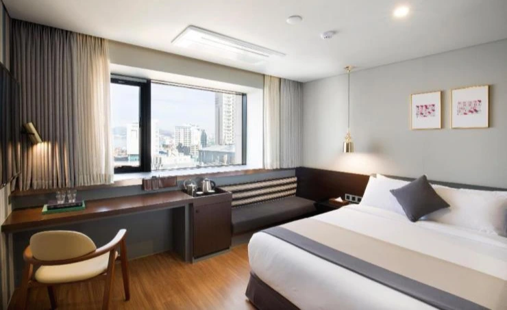 베이 하운드 호텔의 디럭스 더블룸은 액자같은 창문 너머로 영도대교 뷰를 즐길 수 있는 객실이다. 모던한 인테리어가 인상적이며 창문 앞으로는 바 테이블이 있어 전망을 감상하기 좋다.