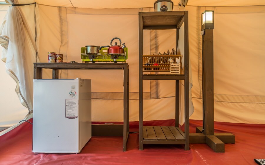 객실에서 취사가 가능하고, 냉장고와 취사도구가 준비되어 있다. 캠핑장 가기 전에 마트에 들러서 맛있는 음식 잔뜩 구매해서 오는 센스!