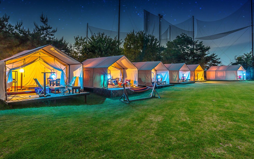 장비가 모두 갖추어져있어 초보 캠핑족들이 몸만 가볍게 즐길 수 있다는 점에서 더 추천하고 싶다. 바람의 언덕은 차로 17분, 퍼스트 가든은 30분 정도 소요된다.