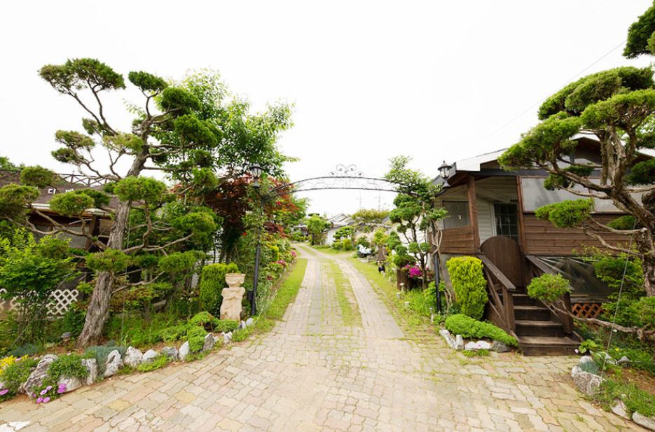 잘 꾸며진 정원 스타일로 분수대도 있는 트루디펜션 ! 밤이 되면 형형색색의 조명들이 더해져서 산책하기에도 좋다.
