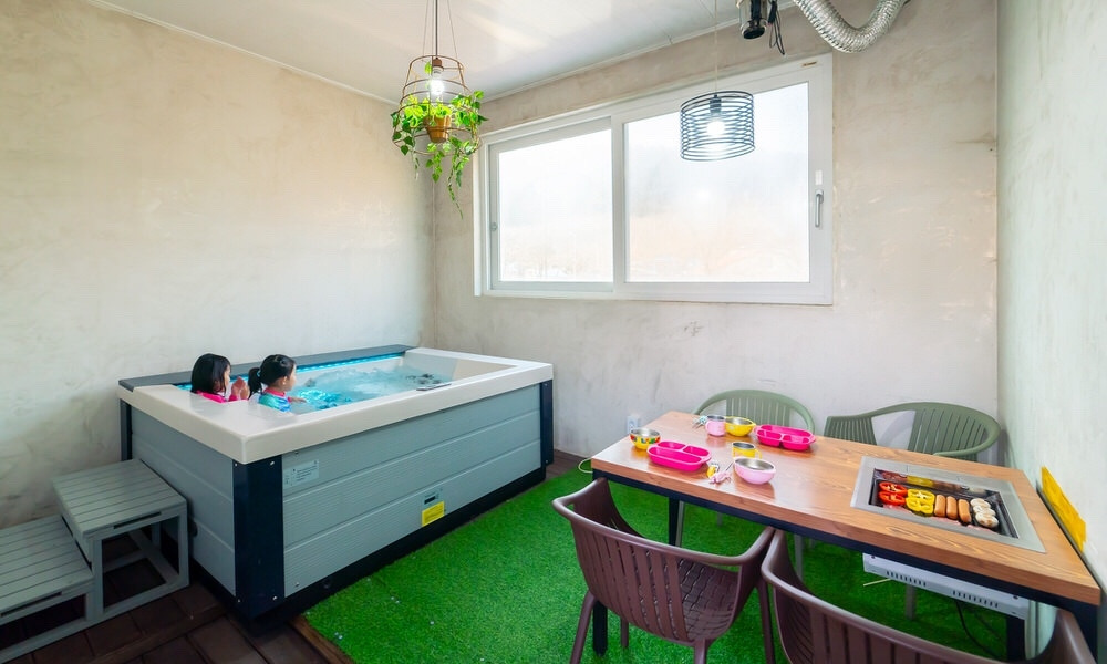 그리고 실내에 제트스파와 바비큐를 동시에 즐길 공간이 날씨와 상관없이 이용할 수 있다.
