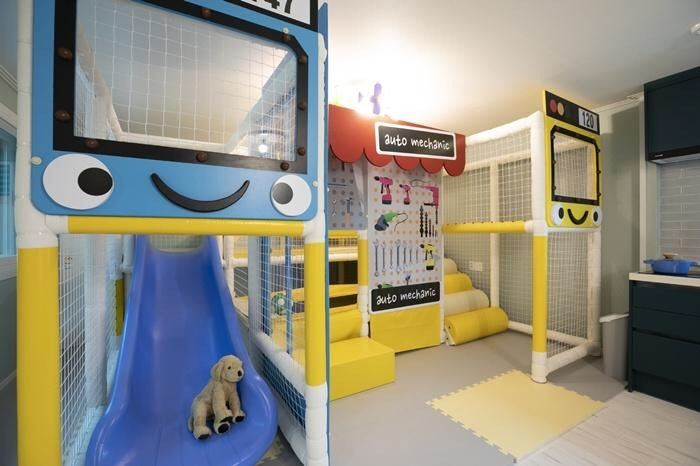 저상형 퀸사이즈 침대 2대가 붙어있어서 이리저리 뒹굴며 자도 안심하고 잘 수 있다. 그리고 아이들을 위한 완구 세트까지 모두 갖추고 있어 아이들이 집에 가기 싫어할 정도이다.