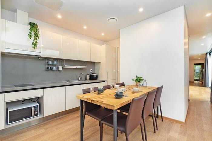 4인 기준의 원룸형 객실인 Sweet Near은 화이트톤과 우드톤이 깔끔하게 정돈된 느낌으로 편안한 휴식을 취할 수 있다. 그리고 객실에 취사도구까지 모두 준비되어 있다.