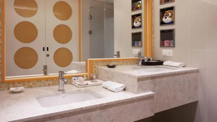 캐릭터 룸 기준으로 욕실에는 어른용 몰튼 브라운과 키즈용 캐릭터 어메니티가 별도로 제공된다. 1회용 칫솔과 치약, 면도기, 빗, 바디 스펀지, 3종 수건, 슬리퍼, 샤워 가운 등도 준비해준다.