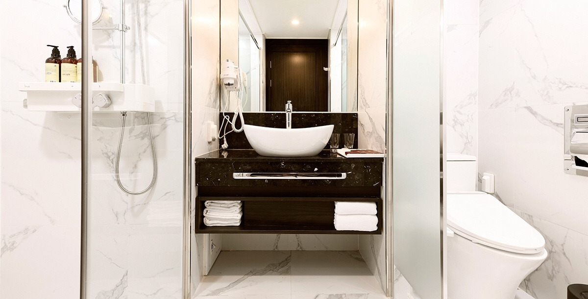 객실 인테리어와는 상반되게 욕실은 모던하면서 고급스럽게 꾸며져 있다. 샴푸, 린스, 바디워시, 비누 등 샤워용품이 구비되어 있고 욕조가 준비되어 있어서 반신욕을 하며 여행의 피로를 풀기에 최고다.