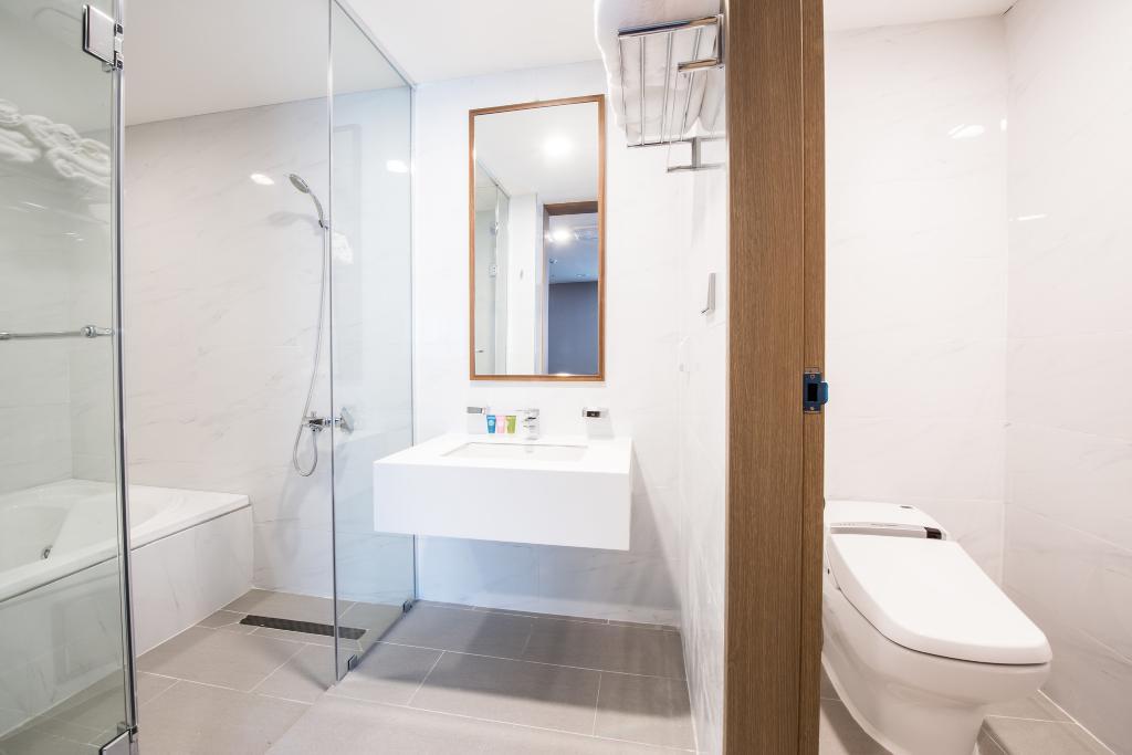 욕실에는 대형 욕조가 마련되어 있어서 아이와 함께 목욕을 하기에도 안성맞춤이다. 샴푸, 바디샴푸, 린스, 비누, 드라이기 등이 제공된다.
