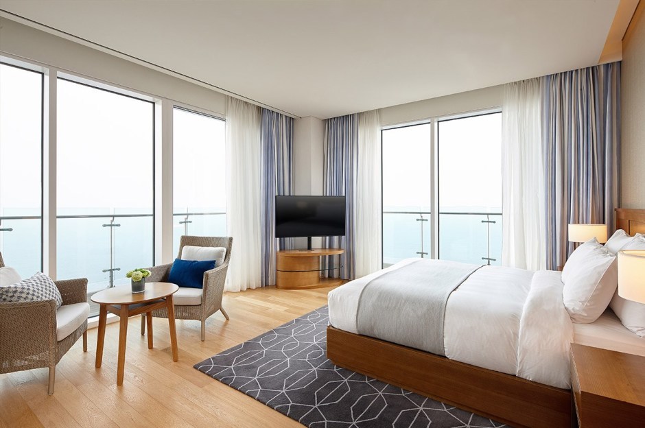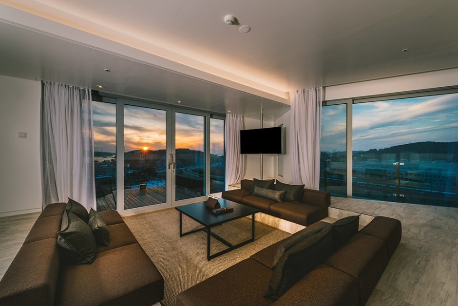 특별한 날을 맞은 가족이라면 펜트하우스를 추천한다. 5베이 구조로 객실 내 모든 공간에서 남해를 포함한 주변 자연경관을 감상할 수 있다. 특히 욕조에서 전망이 끝내준다.