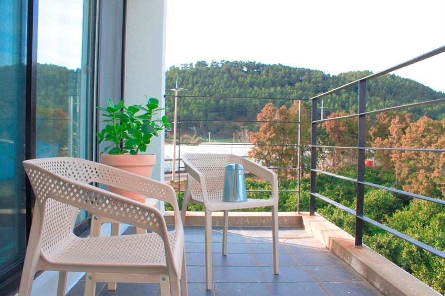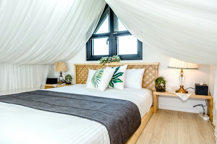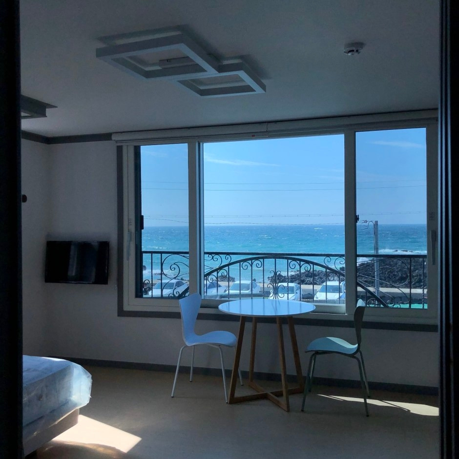 객실 내에는 조리도구가 완비되어 취사가 가능하며, 바다가 보이는 창가에서 낭만적인 시간을 보낼 수 있다. 원룸형 객실이지만 넉넉한 면적과 넓은 창으로 답답한 느낌없이 편하게 머무를 수 있다. 감성 넘치는 인테리어는 덤!