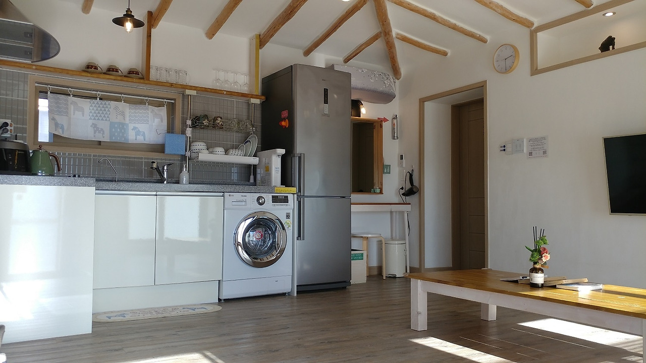 조식은 따로 제공되지 않지만 4인 가족이 와도 충분할 식기와 전기밥솥, 전기 포트, 정수기, 토스터, 냄비, 프라이팬은 물론 각종 양념까지 모두 갖추고 있다! 세탁기와 다리미까지 갖추고 있는 완벽함! 한 달 살기 or 보름 살기 숙소로도 제격이다.
