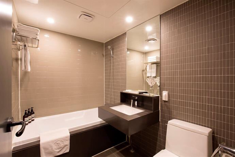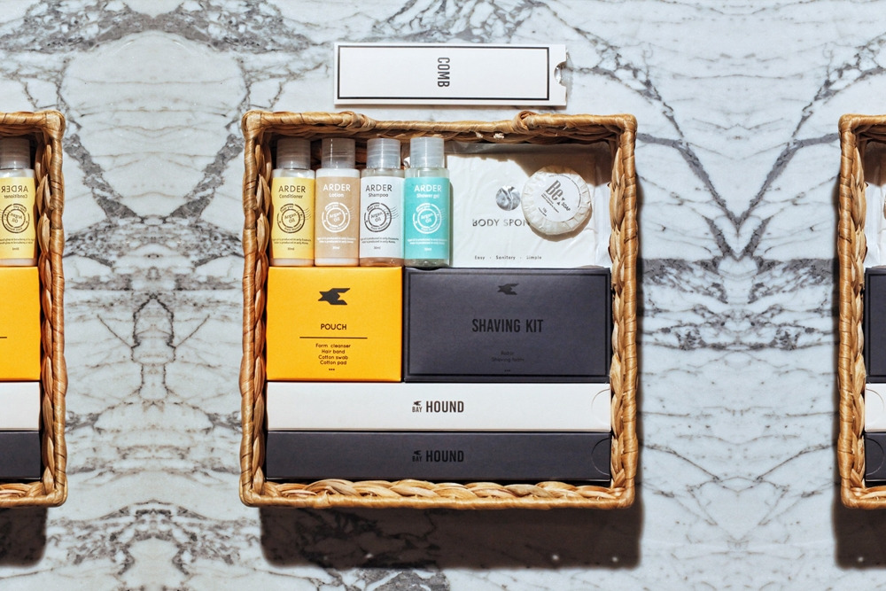 블랙& 그레이 컬러로 모던하게 꾸며진 베이하운드호텔의 욕실. 샴푸, 헤어 컨디셔너, 바디 워시, 바디 로션, 비누, 쉐이빙 키트, 칫솔, 치약 등 아주 꼼꼼하게 준비되는 어메니티까지! 게다가 보기에도 좋게끔 바구니에 담겨져 있으니 가성비에 감동 서비스까지 갖추었다.