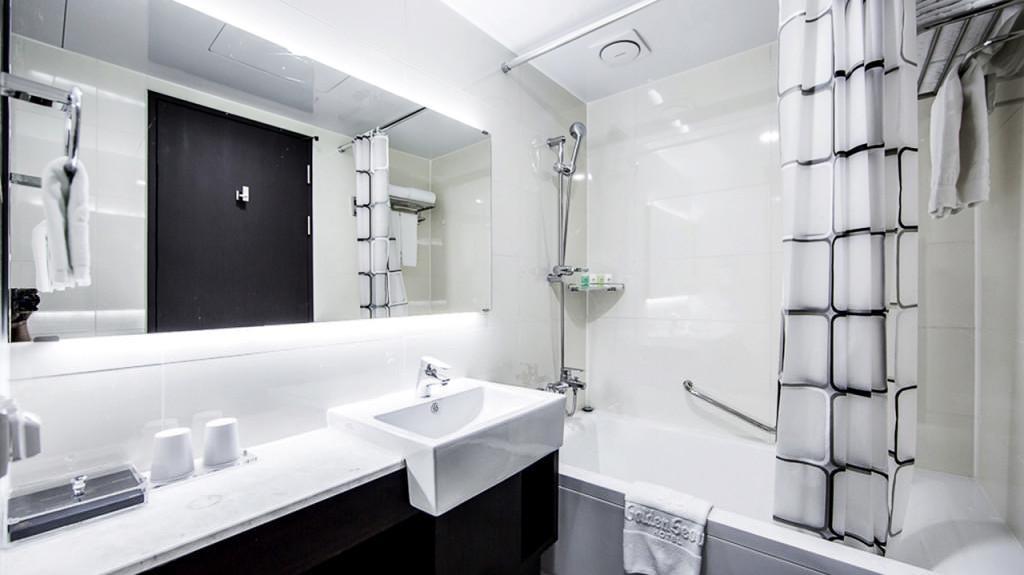 에이든 바이 베스트웨스턴의 욕실. 샴푸, 헤어 컨디셔너, 샤워젤, 비누 등 기본적이 샤워 용품은 물론이며 칫솔 세트와 면도기, 면봉와 머리끈과 같은 일회용품까지 모두 준비되어 머무는 동안 편리하게 지낼 수 있다. 물론 드라이기와 수건, 목욕가운까지 모두 제공된다.