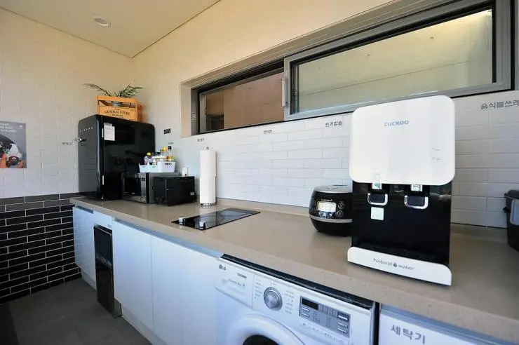 공용주방에는 전자레인지와 전기밥솥, 제빙기, 인덕션, 토스트기 등이 비치되어 있어 간단한 조리가 가능하다. 음료나 스낵은 숙소 내의 스낵바에서 편하게 구매할 수 있다.
