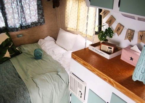 감성 카라반은 이름처럼 내부도 감성적인 인테리어가 돋보이며, 2인용 베드 1개와 2층 침대로 구성되어 있다.
