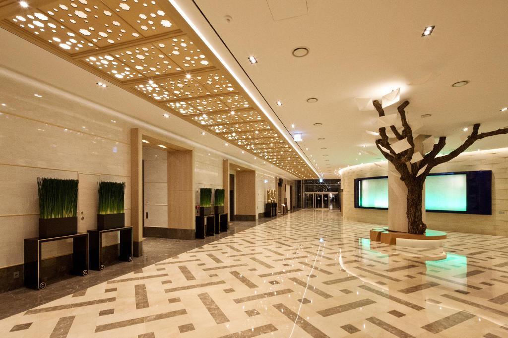 골드 컬러로 고급스러움이 극대화 된 소노캄 고양의 로비. 체크인은 15:00부터 가능하며, 체크아웃 마감시간은 12:00 이다.