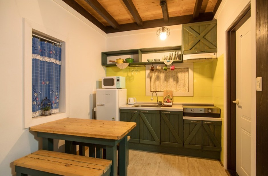 펜션 지기의 꼼꼼함은 주방에서도 엿보인다. 냉장고와 전자레인지, 전기밥솥, 인덕션, 커피포트, 냄비, 그릇, 컵 등 취사 및 식기류가 부족함 없이 채워져 있다. 테라스에서 바비큐도 이용 가능하다.
