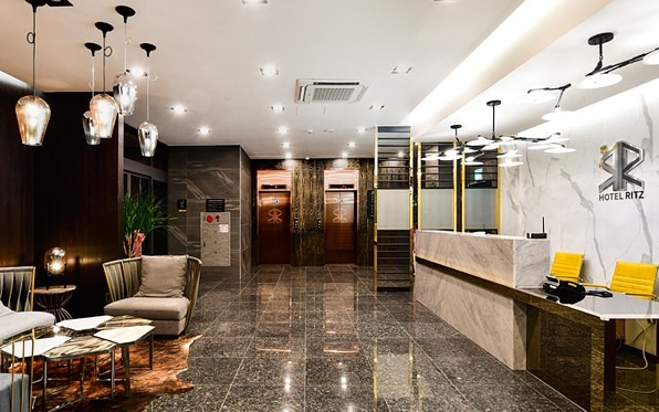 호텔 리츠의 로비는 화사한 조명과 패브릭 소파가 어우러져 아늑하면서 세련된 분위기를 느낄 수 있다. 체크인은 오후 18:00부터, 체크아웃은 오전 11:00 까지 마무리 해주면 된다. 그리고 투숙객 대상 무료로 이용 가능한 기계식 주차장이 마련돼 있다.