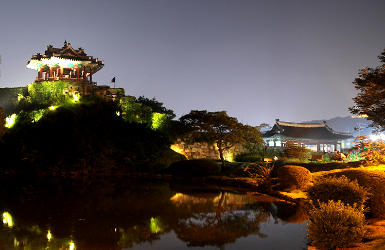 요즘 핫한 ‘서울근교 노을 명소’ 수원 방화수류정. 밤에 만나는 수원 화성은 낮에 만나는 풍경만큼 멋지다는 사실! 18시부터는 무료로 입장 가능하다. 방화수류정은 수원 화성 중에 7개의 무지개 모양 수문이 물에 비쳐 유독 아름답기로 유명하다.
